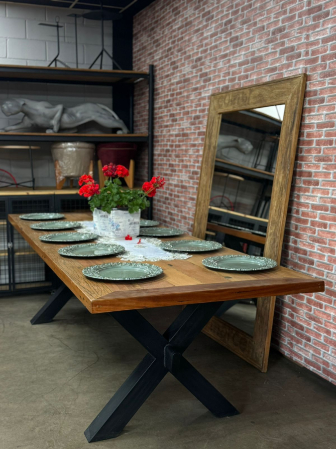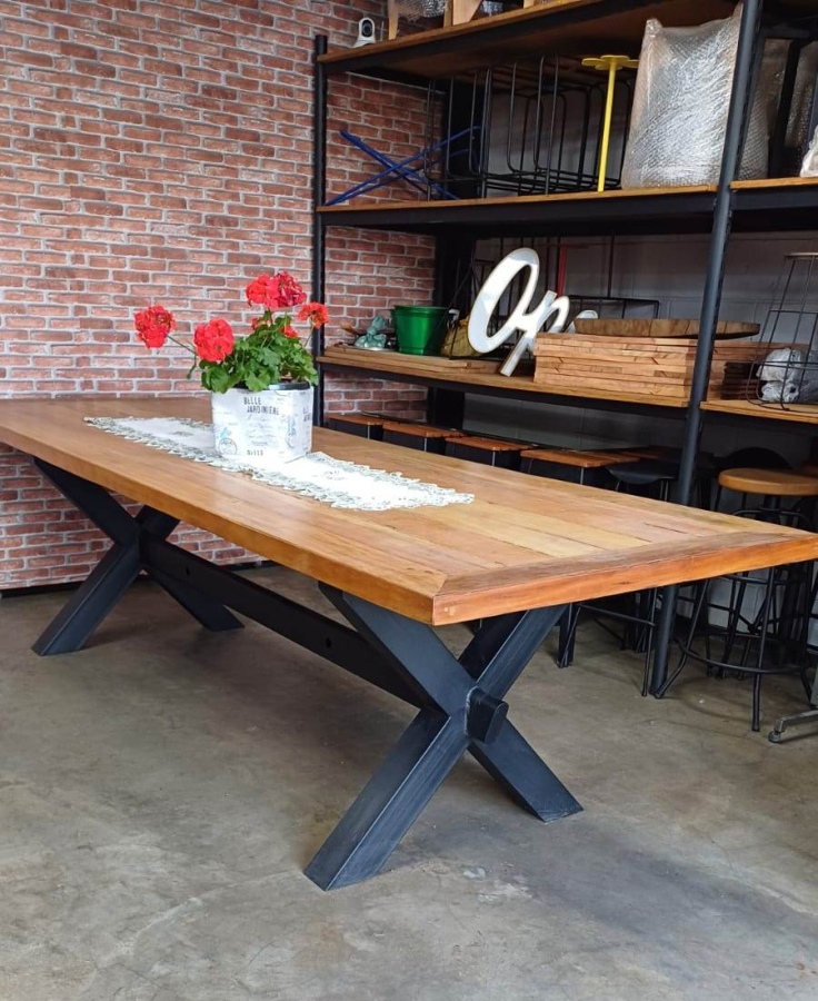 Mesa Retangular para Área Gourmet, sala de jantar, 10 lugares, base em Aço Carbono estilo industrial, madeira de demolição Peroba Rosa, acabamento Pintura eletrostática.